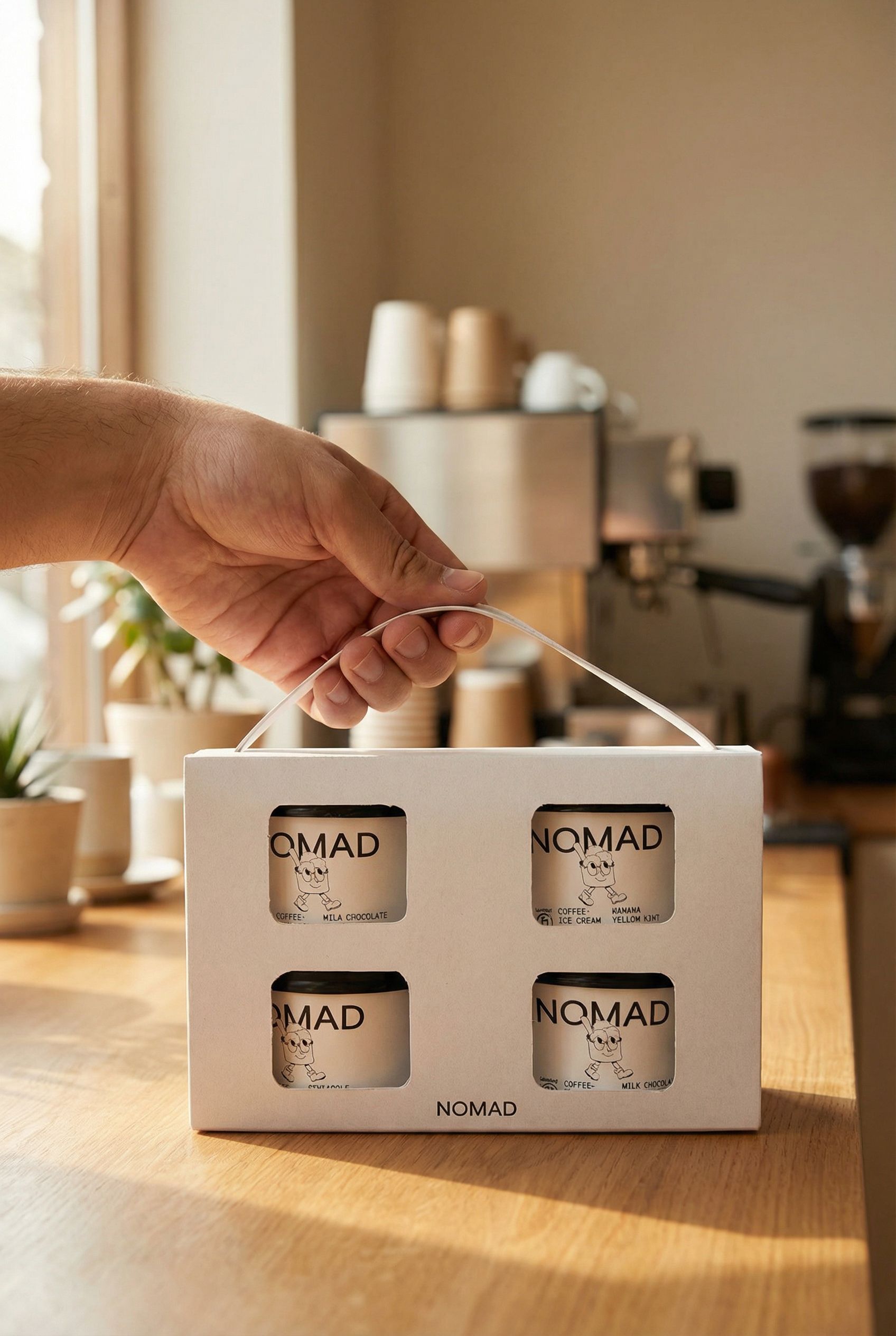 Nomad Coffee condenses the culture of cupping and comparison into a tasting set that makes specialty coffee both accessible and exacting. The four flavors invite analysis: notes, roast, and origin. The industrial minimalism aligns with the brand’s studio-like coffee bars. Play and quality coexist through the tasting set as the exploration and the full size pint as the commitment.